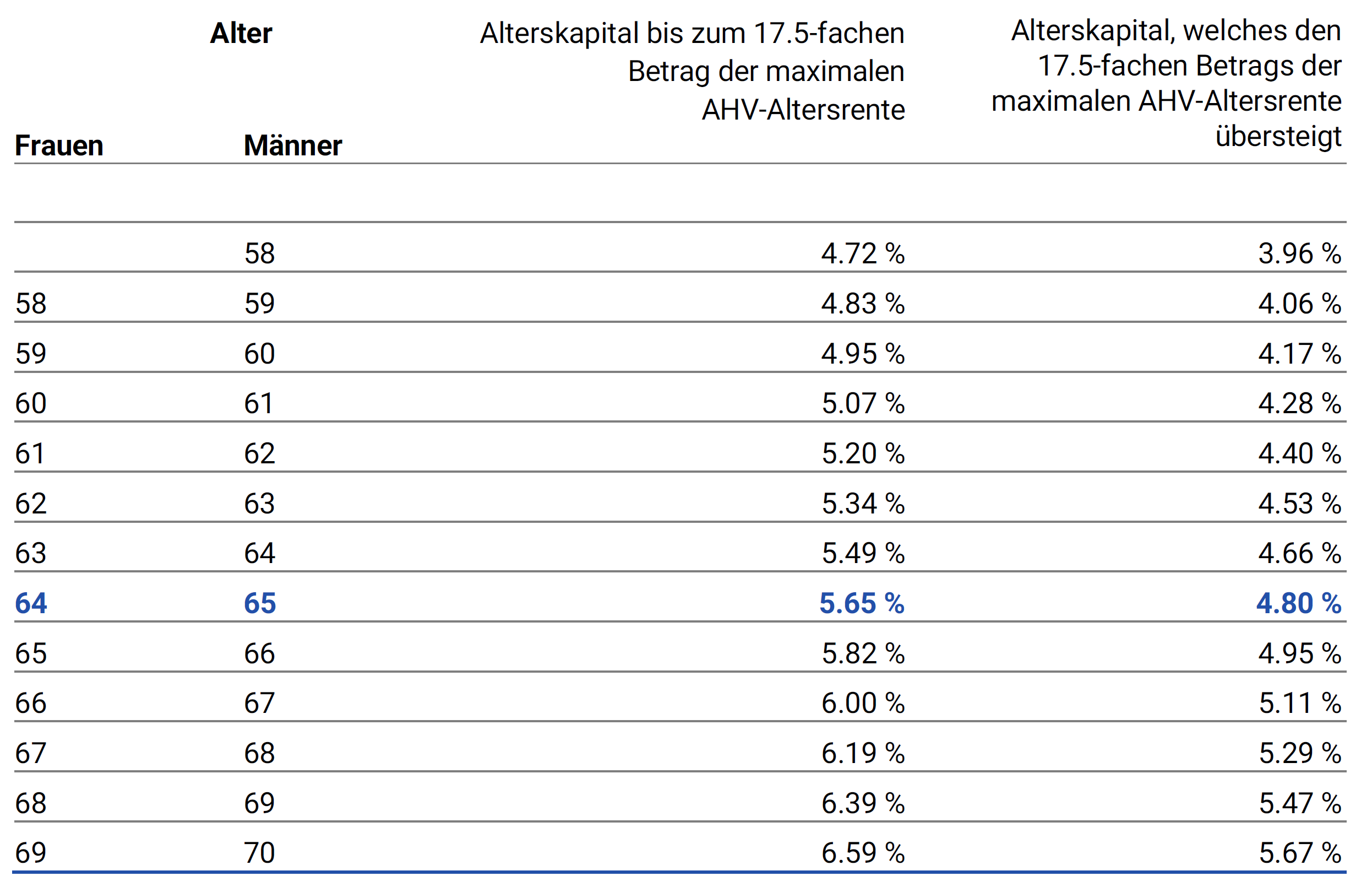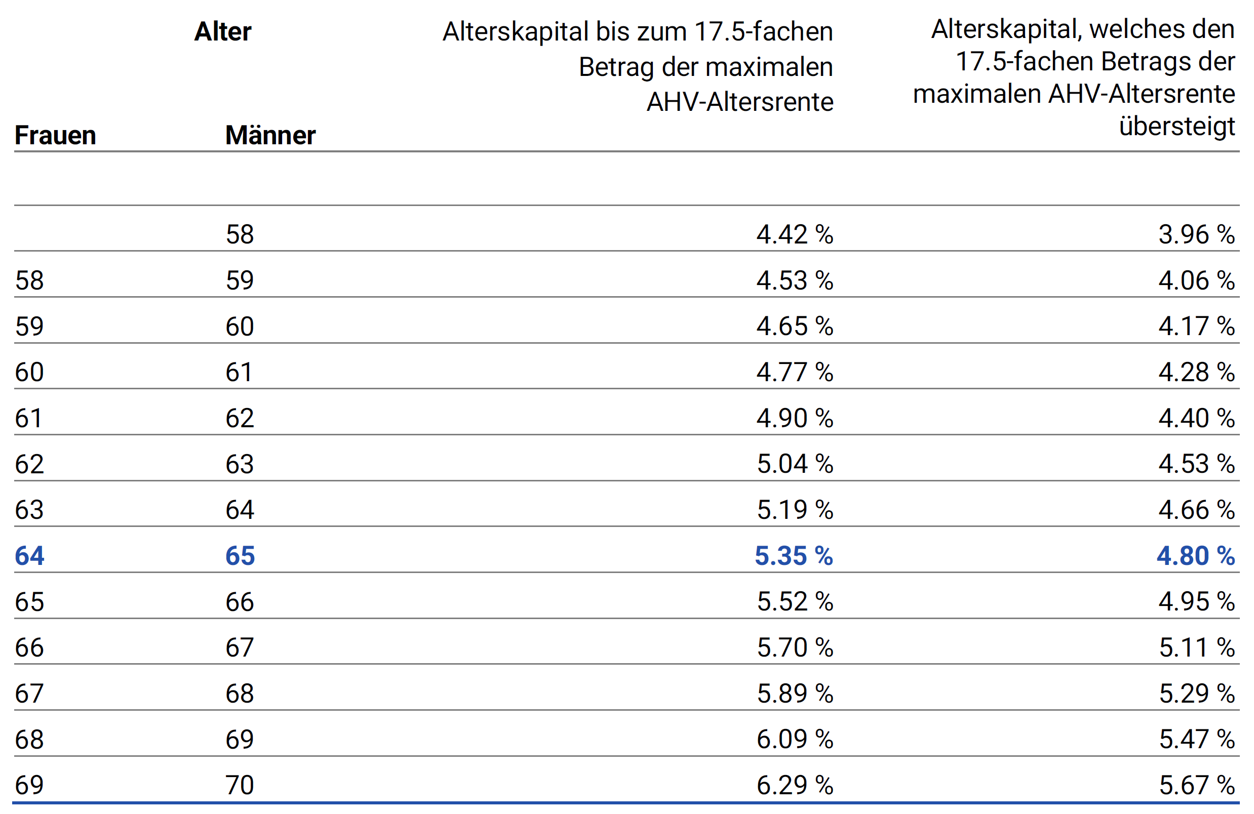 Der reglementarische Umwandlungssatz der PROSPERITA liegt aktuell (Stand: 2023) für Männer im Alter 65 und Frauen im Alter 64 bei 5.65%. Der Anteil des Altersguthabens über einem Betrag von CHF 514'500 (17.5-fache maximale AHV-Altersrente) wird mit 4.8% umgewandelt. Wird die Pensionierung vorgezogen bzw. aufgeschoben, so reduziert bzw. erhöht sich der Umwandlungssatz entsprechend.